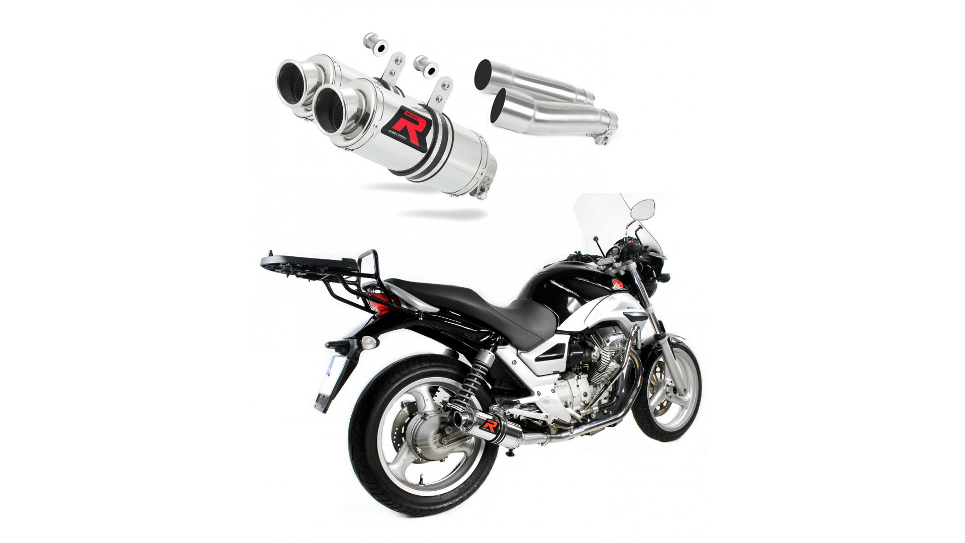 Csomag tartalma: Két Slip-on kipufogó, két összekötő cső, rögzítő alkatrészek.